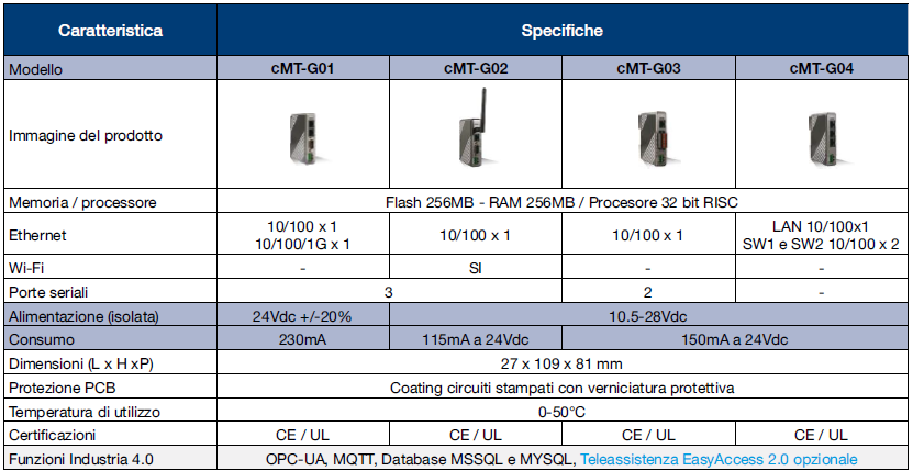 cMT-G0x è la gamma di gateways industriali IIoT di Weintek. Questi dispositivi permettono di integrare qualsiasi driver industriale (tra gli oltre 300 disponibili) in sistemi Industry 4.0 attraverso i protocolli OPC-UA (compliance Certified) e MQTT o mediante database MSSQL e MYSQL. La famiglia è articolata su quattro prodotti. cMT-G01 è il gateway pensato per nuove installazioni. Grazie alla presenza della doppia porta Ethernet, e di tre porte COM, il cMT-G01 può essere collegato a qualsiasi PLC o dispositivo incluso tra i 300 driver ethernet e seriali gestiti. cMT-G02 offre le stesse funzionalità del cMT-G01 offrendo però una porta Wi-Fi come alternativa a una delle due porte ethernet del cMT-G01. cMT-G03 e cMT-G04 sono pensati per il revamping di impianti pre-esistenti. In particolar modo il cMT-G03 è pensato per integrarsi in reti di comunicazione attraverso porte seriali RS232/RS485 mentre il cMT-G04 opera come switch per sistemi basati su architettura ethernet.