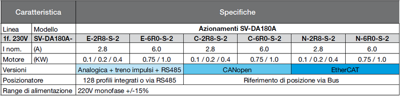- Versioni standard (RS485 + analogica + pulse train) e bus CANopen e EtherCAT