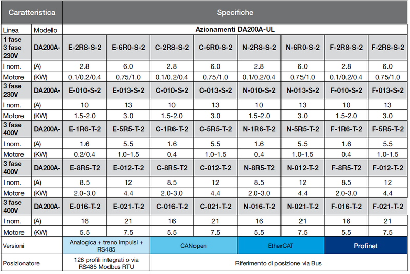 - Versioni standard (RS485 + analogica + pulse train) e CANopen, EtherCAT e Profinet