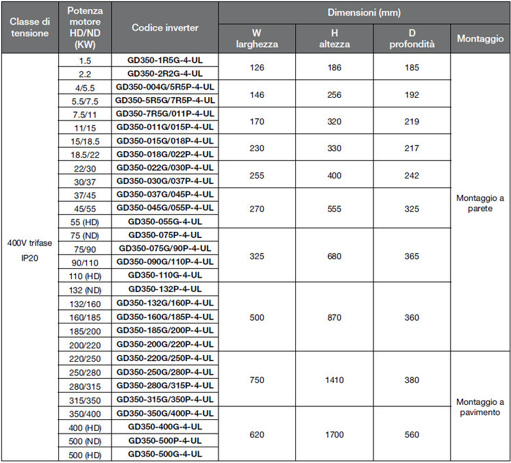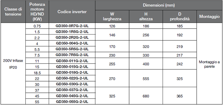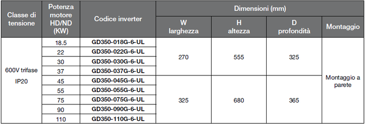 - Versioni 200V, 400V e 600V. IP20 (IP55 non UL)