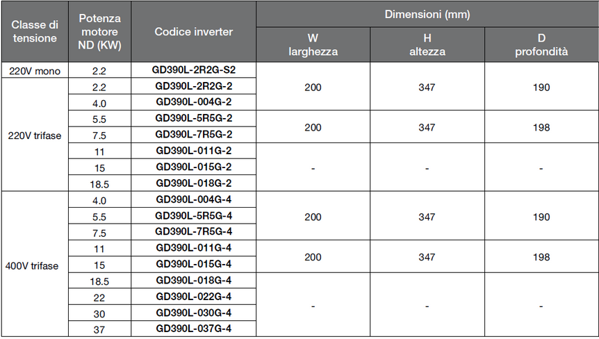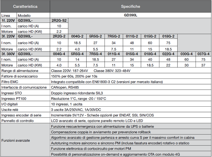 GD390L è l’inverter capace di rispondere a un’ampia gamma di esigenze in termini di prestazioni, affidabilità, semplicità di messa in servizio e, non ultimo, rapporto qualità/prezzo/prestazioni.