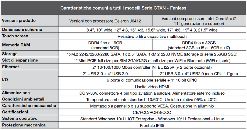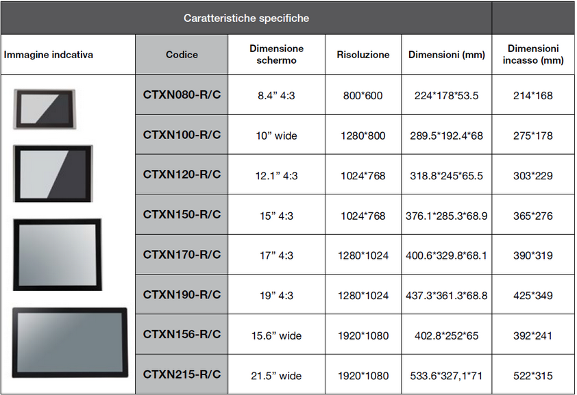 I panel PC EXENTA sono disponibili con formati schermo compresi tra 8” e 21.5”, touch screen capacitivo o resistivo, processori Intel Celeron e Core i5/i7 di diverse generazioni, in funzione delle esigenze di impiego.
