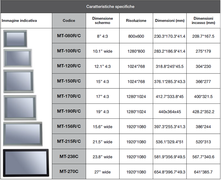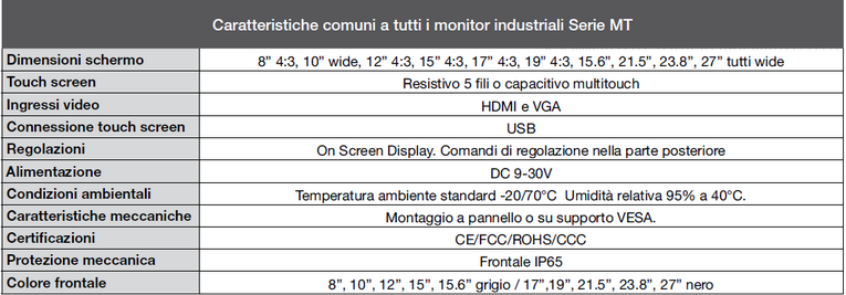 La proposta di display industriali EXENTA MT, da 8” fino a 21.5”, con touch screen resistivo o capacitivo, caratterizzati dalla costruzione estremamente robusta e da un rapporto qualità prezzo eccellente.