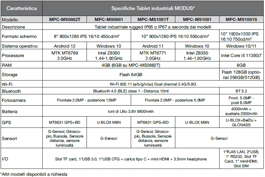 I tablet Modus, sono dispositivi rugged, per impieghi particolarmente gravosi, in condizioni ambientali difficili.